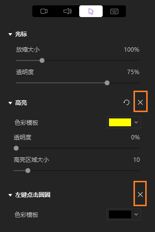 首先,在工具栏的左下角找到“光标”(滑动滚动条到最下方)。您可以添加5种特效:高亮、聚光灯、放大镜、左键单击圆圈和左键单击声音。