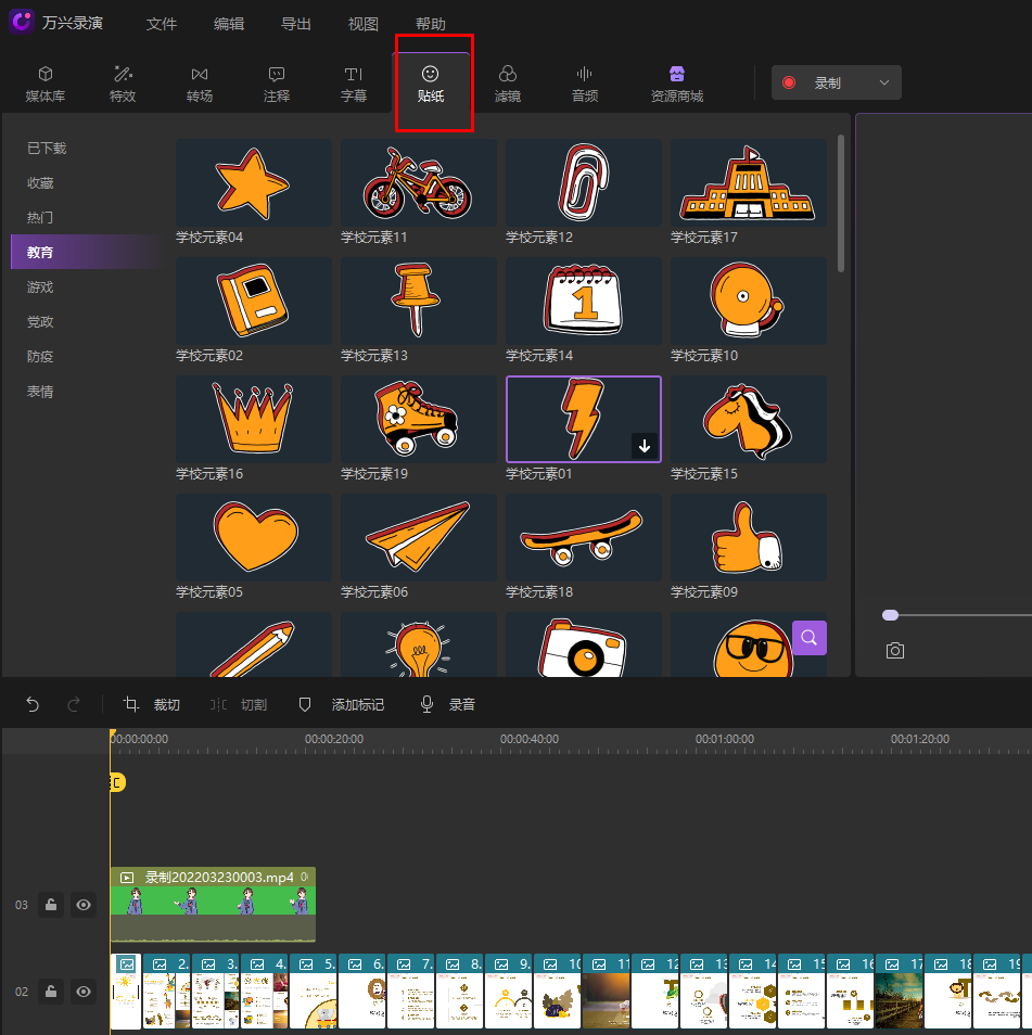 调整ppt时长,在部分片段还可以加入贴纸等丰富您的微课。