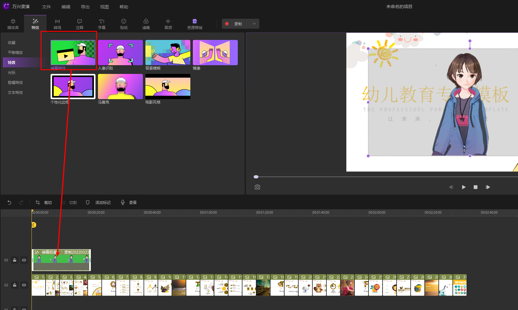 然后使用绿幕抠像功能,拖拽到人物轨道上。