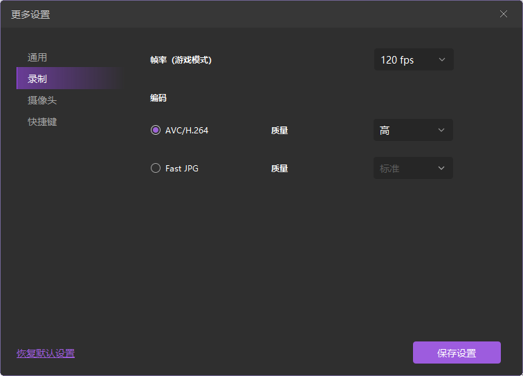 游戏录制中,帧率建议至少60帧,如对游戏录制有更高要求,可以设置为120帧。在编码上,可以调整为h264编码且质量调整为高。(摄像头设置同理)