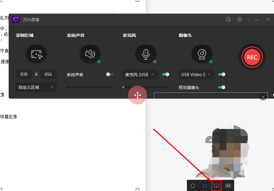 使用日韩免费视频观看录演进行摄像头录制的时候,可以通过ai自动抠像,在录制的过程即可自动直接抠像。进入标准录制,选择预留摄像头,鼠标移动到人像下会出现菜单,点击下图标记的小icon即可实现ai自动人物抠像。(背景最好为非黑色以及衣服与背景颜色不能相同)