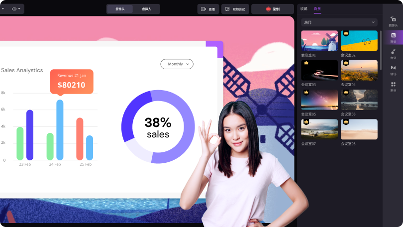 美颜功能将自动调整摄像头捕捉您的肖像,使您的上镜形象更加动人。