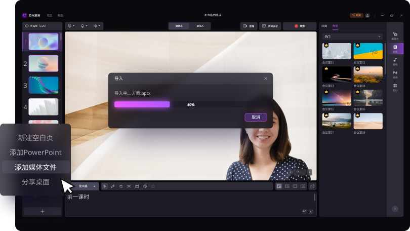 除了支持内容面板直接编辑, 还可以分享桌面、应用窗口、PPT和其他媒体文件。